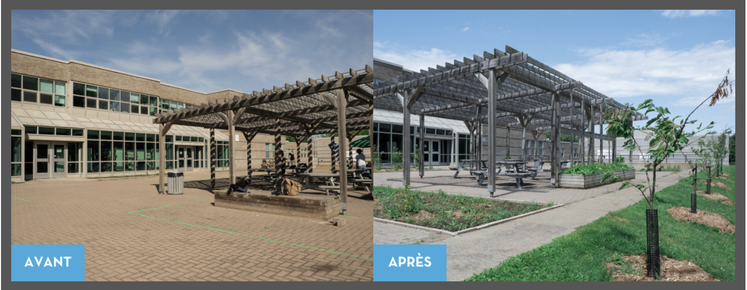 En juin 2024, l’Éco de la Pointe-aux-Prairies a transformé une partie de la cour arrière de l’école secondaire Jean-Grou afin de créer un îlot de fraîcheur et de biodiversité, tout en fournissant un espace collectif chaleureux pour la communauté de l’école. L’aménagement intègre également de nombreux végétaux comestibles pour les élèves et le personnel enseignant.